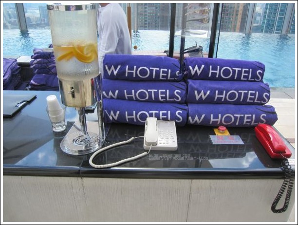 找了兩張沒放東西的躺椅,把我們的隨身物品、手機放在躺椅上,浴衣脫一脫,戴上泳鏡,就直接下水了(記得要先做暖身操)。W酒店的游泳池,只需穿著泳褲、泳裝,不用戴泳帽,就可以使用了~
