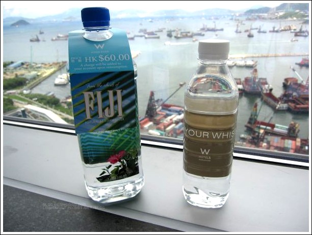 左邊是酒店房間內擺設的,要價HK$60元(折合台幣約225元)的礦泉水;右邊是W酒店免費提供的瓶裝水。