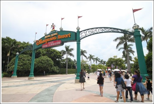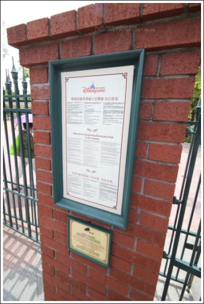 ▲ 到了入口囉,入口告示牌寫著蒞臨香港迪士尼樂園以及禁止攜帶食物等等的說明字樣。