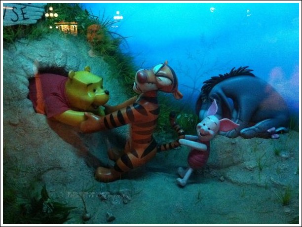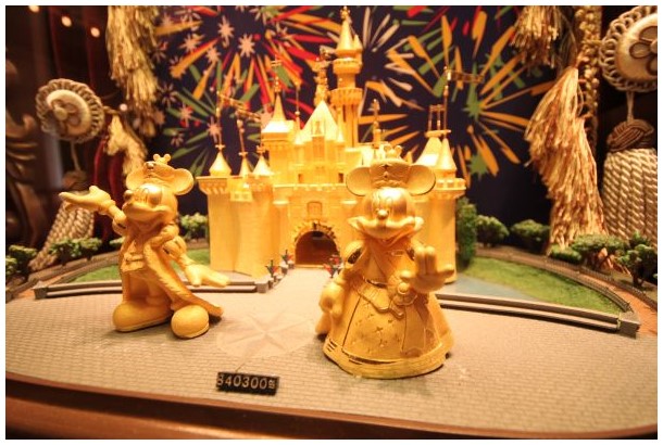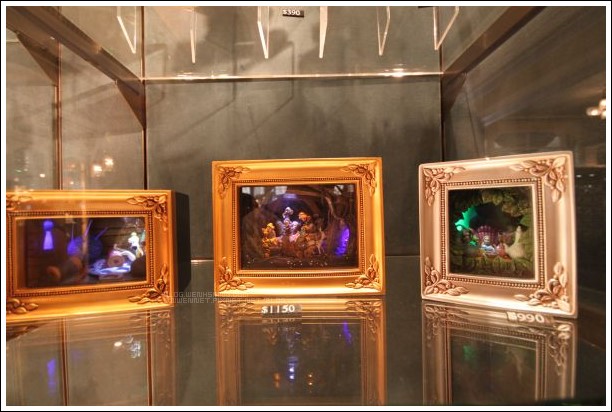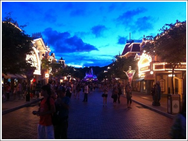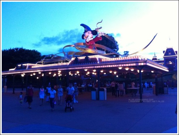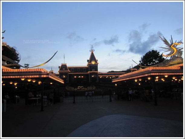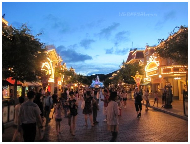 天色已經由藍轉黑了,迪士尼樂園裡有不少遊客已經準備歸返了,但留在園裡的人潮還是很多。各種造景、櫥窗都已經亮起了燈光,形成另一種與白天截然不同的景色。